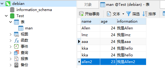 @RequestMapping(value = "/addMan",method = RequestMethod.GET) @ResponseBody public String addMan(@RequestParam(value="name",required=false,defaultValue="hello") String name, @RequestParam(value="age",required=false,defaultValue="24") int age, @RequestParam(value="information",required=false,defaultValue="我是hello") String information){ String sql = "INSERT INTO man VALUES ('"+name+"', "+age+", '"+information+"')"; return "影响行数" + jdbcTemplate.update(sql); }