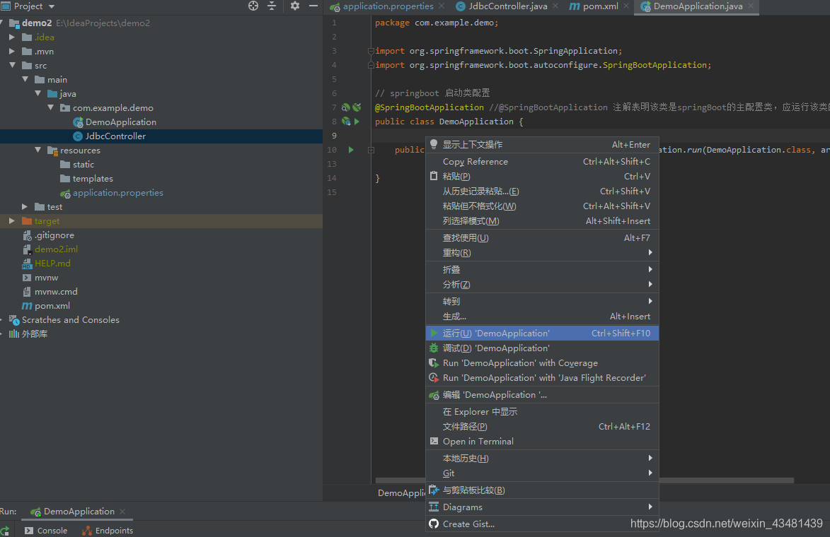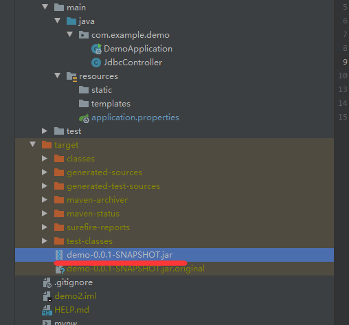 在 target 文件夹中多出一个 demo-0.0.1-SNAPSHOT.jar 就是打包好的jar包