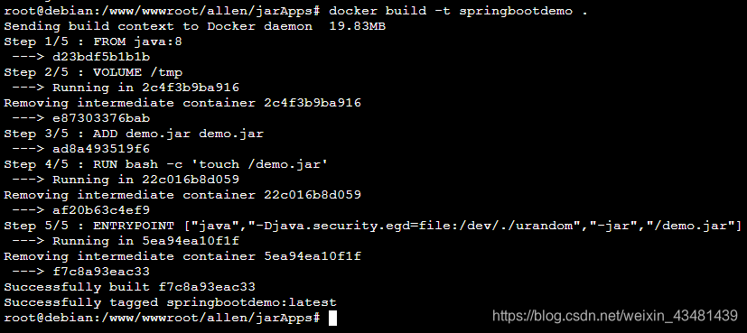 cd到存放jar包和Dockerfile文件的目录下,执行下列语句制作镜像(注意末尾的" ."不能漏):